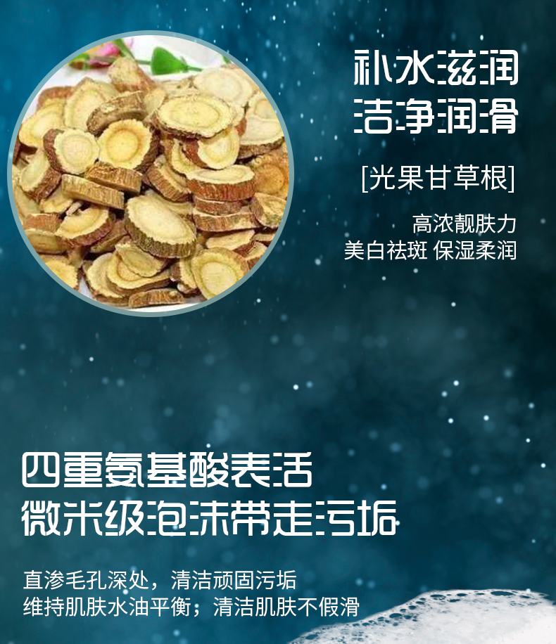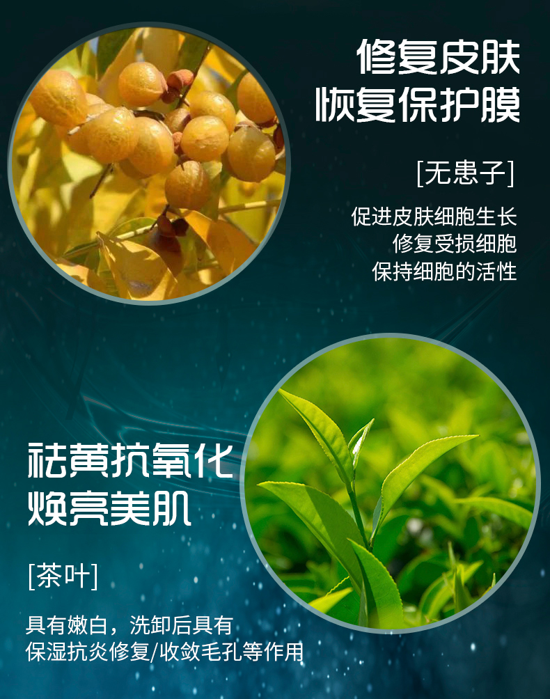 产品成分:无患子果、茶叶、光果甘草根、积雪草等提取物